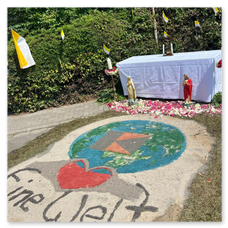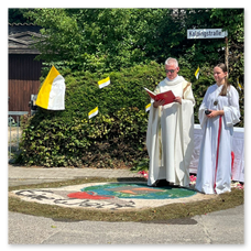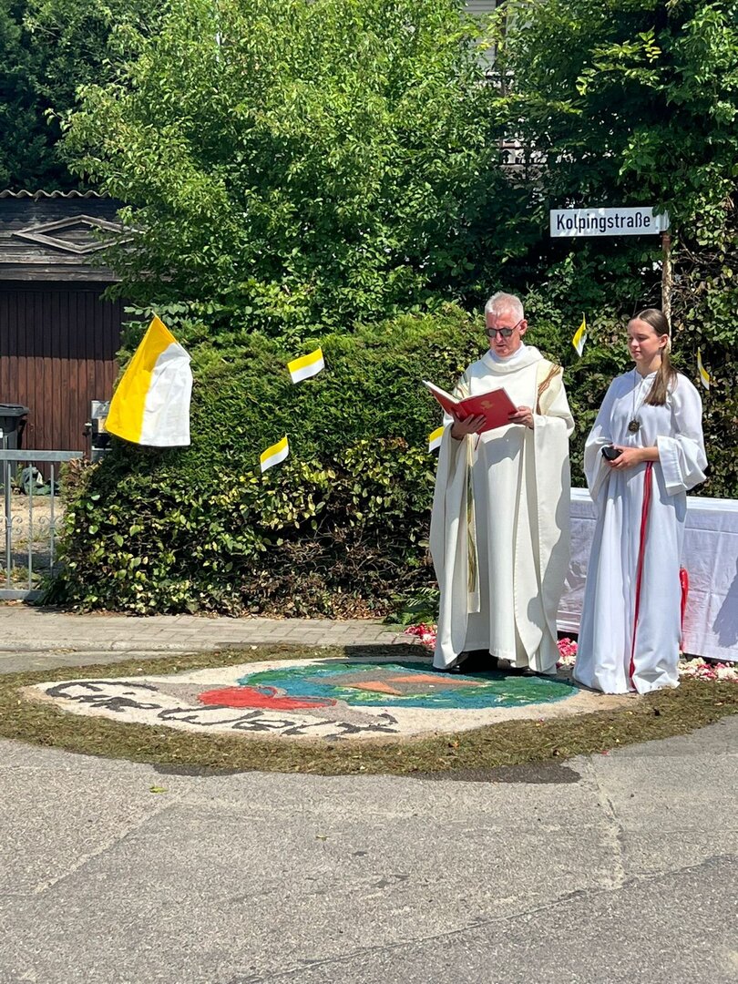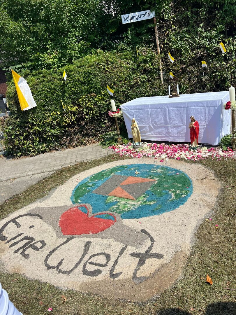 Einige Mitglieder gestalteten einen Altar, natürlich in der der Kolpingstraße und auch unsere Banner waren bei der Prozession dabei.