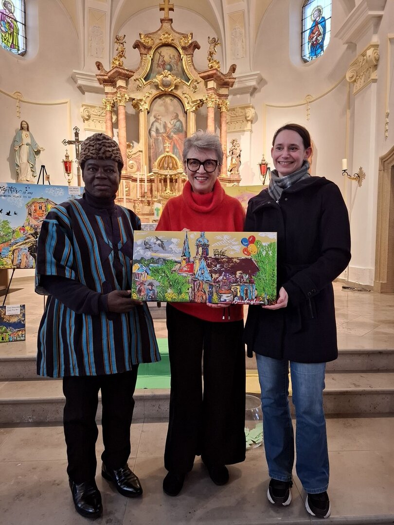 Mechthilde Gairing hatte extra für diese Ausstellung ein Gemälde der beiden Beindersheimer Kirchen gespendet, das während der Veranstaltung verlost wurde.