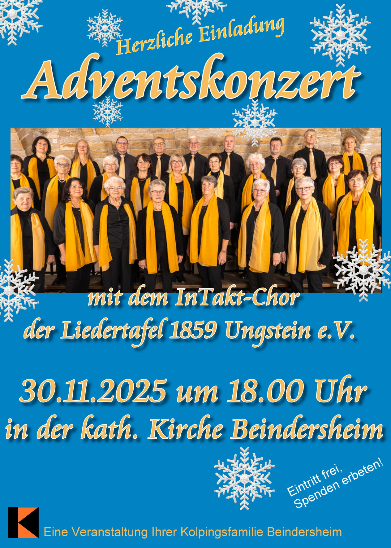 Am 30.11.2025 um 18:00 Uhr lädt die Kolpingsfamilie zum Adventskonzert mit dem InTakt-Chor aus Ungstein ein.
